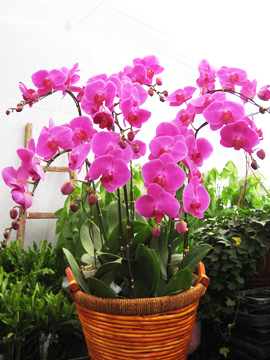 蝴蝶蘭的學名按希臘文的原意為“好似蝴蝶般的蘭花”。它能吸收空氣中的養分而生存,歸入氣生蘭范疇,可說是熱帶蘭花中的一個大族。它的植株非常奇特,既無匍匐莖,也無假球莖。每棵只長出數張活象湯匙般肥厚的闊葉,交互疊列在基部之上。白色粗大的氣根則露在葉片周圍,有的攀附在花盆的外壁,極富天然野趣。到了新春時節,一枝長達盈尺的花梗就從葉腋抽出,然后一朵接一朵地開放。每花均有5暮,中間嵌鑲唇瓣;ㄉr艷奪日,既有純白、鵝黃、絆紅,也有淡紫、橙赤和蔚藍。有不少品種兼備雙色或三色,有的好像繡上圖案的條紋,有的又有如噴了均勻的彩點,每枝開花七八朵,多的十二三朵,可連續觀賞六七十天。蝴蝶蘭約100種,原產歐亞、北非、北美和中美。喜歡高氣溫、高濕度、通風透氣的環境;不耐澇, 耐半陰環境,忌烈日直射,忌積水,畏寒冷,生長適溫為22~28℃,越冬溫度不低于15℃。