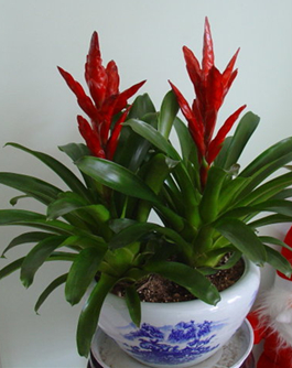 富有異國風情的“鶯歌鳳梨”,以其端莊秀雅、體態輕盈的風貌,陸續進入尋常百姓家。它植株矮壯,葉形似劍,渾身勻稱,花姿奇美。每當冬去春來,葉叢之間就會抽出一簇羽狀紅花,花緣鑲有金邊,內高外低,層疊而上,恍如林間一群黃鶯,前依后偎,歡欣雀躍,顯露出一種“流鶯自惜春將去,銜住飛花不忍啼”的情調,特別是它正當春節盛開,更令人們傾心不已。